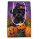 Förbered Halloween-andan med den här fantastiska designen som har en söt hund i en häxhatt omgiven av skrapade pumpor. Perfekt för att lägga till en aning pooky charm till ditt festliga firande.
