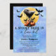Spooky Bride på en Tini Bit Martini Inbjudningskort för möhippan - Med en svart drink i ett martinistiskt glas försedd med döskallar och orange pumpor. Black fladdermus flyger runt och en fullt gult i måne ligger i bakgrunden. Ett blått och lila stjärni, mystiskt och celestialt himmel är bakgrunden till denna gata, häxaktiga vibes möhippa inbjudan. Perfekt för en Halloween-Möhippa eller gotisk Möhippa. All text kan redigeras. Finns som en omedelbar digital nedladdning, perfekt för att skicka via text, e-post eller social-media.