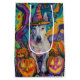 Förbered Halloween-andan med den här fantastiska designen som har en söt hund i en häxhatt omgiven av skrapade pumpor. Perfekt för att lägga till en aning pooky charm till ditt festliga firande.
