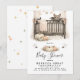 Celebrate your upcoming arrival with this enchanting and subtly spooky baby shower invitation! Perfect for parents who adore a blend of gothic charm and whimsical cuteness, this design features an adorable baby bat peeking over a beautifully detailed gothic-style crib, draped with soft pink curtains and bedding. A charming cluster of pastel pumpkins sits below, adding a touch of autumn magic, further enhanced by delicate spiderweb accents.