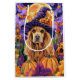 Förbered Halloween-andan med den här fantastiska designen som har en söt hund i en häxhatt omgiven av skrapade pumpor. Perfekt för att lägga till en aning pooky charm till ditt festliga firande.