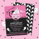 Smaklig rosa och svart barnvänlig Halloween fest-inbjudan med ett viskigt spöke i jack-o-lantern mugg och en usel svart katt som gömmer bakom den. Den angivna mallen gör det enkelt för dig att anpassa den med egen information. Baksidan är svart med ett helt vitt spöke mönster. © ArianeC Illustrations-Alla höger reserverade