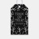 Lägg till en speciell beröring till dina Halloween fest-favoriter och bus eller godis-väskor med de här skämtsamma Halloween-märkrna! Utformningen har en gräns av dansande skelett med "Bus eller godis" som visas med vit benskrift. Anpassa framsidan av märkrna med skel- och skelettpresenter med anpassningsbarna hälsning, namn eller annan anpassningsbar. Märkrn för gåva från bus eller godis går tillbaka till visningen med ett svart och vitt ben mönster.