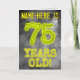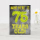 På framsidan av detta skådespel tittar personligens födelsedagskalendrar med texten "75 ÅR gammal!", med tecken och siffror som har ett mystiskt glänsande aura-inspirerat utseende, på ett grått grumligt, dimmigt inspirerat mönster. På framsidan finns också en redigerbar mottagare av namn. Insidan innehåller ett meddelande från hälsning som kan redigeras. Ett sådant här hälsningskort för anpassadets födelsedag kan vara ett speciellt sätt att skicka ett födelsedagsmeddelande till någon som firar sin sjuttiofemte födelsedag. [~Z0000365]