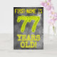 På framsidan av den här örren tittar anpassadets födelsedagskalender med texten "77 ÅR gammal!" med tecken och siffror som har ett glansigt glansigt utseende som inspirerar till en mystisk grått grumlig, dimmig bakgrund mönster. På framsidan finns också en mottagare av personlig namn. Insidan innehåller ett meddelande från hälsning som kan redigeras. Ett sådant här hälsningskort för personligens födelsedag kan ges för att fira någons sjuttiosjunde födelsedag. [~Z0000365]