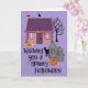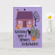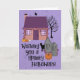 Halloween-härdkort som önskemål du har ett skämt Halloween har ett par gravsten med en svart katt, pumpor och svampar tillsammans med en stuga med viner och en korv på toppen.