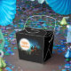 Ta ut stil-affischlådor med skämtsamt Halloween hemsökt hussilhuett på en månbelyst bakgrund med orangen "Happy halloween". Klicka på Anpassa om du vill lägga till en egen text.