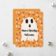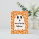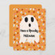 A cute hand drawn illustration of festive blend of ghosts and pumpkins on a vibrant orange background, evoking a playful Halloween spirit.