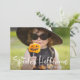 Vitt Spooky Halloween-penselbrev fotokort Helgdag. Skicka Halloween hälsning till familj och vänner med det här anpassadets platta fotokort. Den innehåller penselbokstäver, illustration av fladdermus samt vita punkter och orangar mönster. Denna roligt och det moderna Halloween-kortet finns i andra färg.