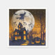 Halloween-napkin med ett glansande hemsökt hus under en fullt måne, med en häxfluga över natten himmel och jack-o’-lyktor som lyser på varvet. En dramatisk och pookisk utformning som anger tonen för Halloween fest, hemsökta husmöten eller oktober-evenemang.
