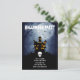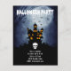 Vykortsinbjudan med ett svart hemsökt hus, en skalle och ett spöke på en svartblå månbelyst kväll. "Halloween fest" är skrivet i ett vitt teckensnitt för droppning. Anpassa och anpassa informationen om party. Kortet är skämtsam, eterisk, läcker och coola.