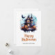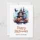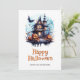 Halloween-kort med hemsökt hus, fullt, fladdermus och ett skelettspöke. Anpassa enkelt det här vattenfärgen Halloween-kortet med din familj namn och text.