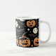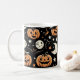 Ett festligt Halloween mugg med jack-o'-lyktor, fladdermus, stjärnor och ett halvmånsfärande måne mot mörkens bakgrund. Perfekt för att lägga till en aning pooky charm till Halloween firande.