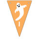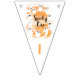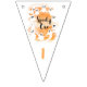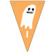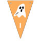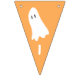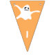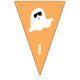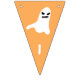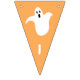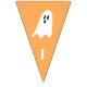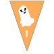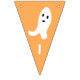 Födelsedagsfesten för den vita hallopoltemafejen med illustration av skämt spöken på orange vatten färg med ett svart och vitt övertryckt spöke mönster tillbaka. I texten står det "Spooky One". Originalteckningar av Caroline Bonne Müller