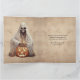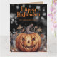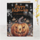 Happy halloween-kort med en spooky-pumpa i kyrkogården mot mörkens stjärnnattbakgrund. Ett spöke med en jack-o'-lantern inuti. Anpassa enkelt det här äckliga Halloween-kortet med din familj namn och text.