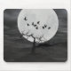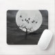 En flock svarta ravens i silhuette flyger över ett ödesolat landskap framför fullt måne.