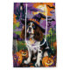 Förbered Halloween-andan med den här fantastiska designen som har en söt hund i en häxhatt omgiven av skrapade pumpor. Perfekt för att lägga till en aning pooky charm till ditt festliga firande.