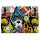 A bold, energetic sports collage featuring basketball, football, soccer, tennis, and baseball elements with dynamic typography like “Big Game,” “Goal Time,” and “Winner,” set in bright, high-contrast colors.