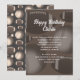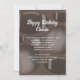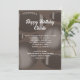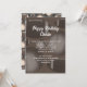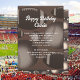 Manlig födelsedagsinbjudan med sporttema. Fotbollar och basebollar utgör designbakgrunden för vit text att anpassa på två ställen. Nyanser av brunt, med bollmönster även på baksidan av korten.