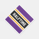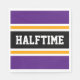 Den här sportiska, atletiska designen har fet HALFTIME-text inuti ett markerat svart mittfält rand med vita och gult tävla ränder mot yttre ränder av royal lila. Texten kan vara personlig.