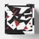 Olika vita och röda geometriska former är spridda över en svart bakgrund och skapar en skarp kontrast. Vissa former är sammankopplade med tunt vitt linjer, och röda prickar lägger till ett popo av färg i sammansättningen.