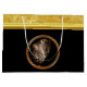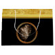 gulaktig brun leopard tittar på dig. Wildlife bild med guld foil struktur och en svart baksida.