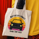 Cool custom road trip tote bag for spring break or summer vacation with your family or friends. Personalize with your last name or group above the retro sunset and car silhouette. Cute keepsake souvenir for a trip to a cottage or across the country. Drive off into the sunset with this shirt.