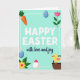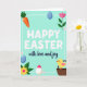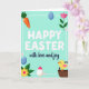 This card features a flat, pastel illustration that feels like a springtime note shared between close friends. In the center, rounded white lettering delivers a festive greeting, while a smaller dark blue line of text sits just beneath it like a gentle underline. A mint green background keeps everything soft and airy, and an incomplete white frame wraps around the message with small pink dots marking the corners. In the upper left, an orange root vegetable with leafy green tops leans inward, as if joining the scene. The upper right pairs a pale pink flower with a smooth sky-blue egg shape, and the lower left repeats the egg shape beside a yellow flower with a pink center, like matching details on two sweet notes. At the lower right, a fluffy yellow chick with pink wings and an orange beak rests in a woven brown basket, giving the layout a tender, caring touch 🐰🌷. Near the bottom center sits a white egg shape topped with a small pink cap.
