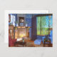A cozy reading corner on a sunny spring day. Warm sunlight streams in through the lattice windows, leaving shadows on the wall and lighting up the cherry blossom "snowglobe" on the bookshelf. In the window is a colorful suncatcher sparkling in the light. Around the hearth are cushy armchairs, with vases of flowers and books and a steaming teacup, but the windows are open to let in the spring breeze. Outside a spring-green willow and beech hedge and red Japanese maple are surrounded by tulips and cornflowers, while a ginger cat stalks through the long grass.