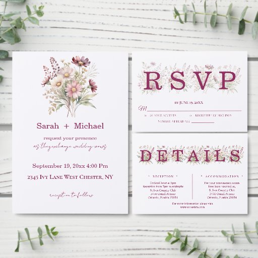 Provide your guests with all the essential information in style with the Spring Floral Wine Wedding Details Card. Designed to coordinate perfectly with Script calligraphy invitation suite, this card keeps travel, accommodation, and schedule information organized while maintaining the romantic, elegant aesthetic of your wedding stationery.