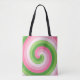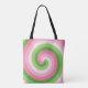This image is a vibrant, psychedelic spiral design made up of thick, colorful bands that swirl from the center outward. The colors—yellow, orange, magenta, green, and dark purple—alternate in a repeating, hypnotic pattern, evoking a retro or pop-art aesthetic. The strong contrast and symmetry create a feeling of energy and movement, making it visually striking