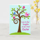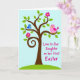 This design shows a stylized spring scene with a brown tree at the center, its arching branches dotted with fresh green leaves and two fuchsia blossoms with yellow centers. A pale blue sky sits behind the tree, fading into a rich green hillside that suggests new growth 🌷. On the left branch, a plump sky-blue bird perches with a small smile, angled toward the right as if watching its companion with gentle affection. On the right branch, a rounded soft pink bird faces back toward the blue one, their close spacing and mirrored poses hinting at a sweet bond 🐇. One lower branch curls into a spiral, adding a soft, flowing detail that draws the eye downward. The message “Love to Our Daughter on her First Easter” appears prominently across the upper area in fuchsia lettering, standing out against the pale blue background. Below the words, the tree trunk and the green foreground create a simple base, while the two bright blossoms sit near the birds like little bursts of color.