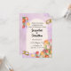 A soft and romantic wedding invitation featuring colorful tulips and elegant gold wedding rings on a gentle pink watercolor background with an arched design in the center.