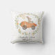 This adorable throw pillow features a cute bunny riding a carrot car framed with lush wildflower wreath.
