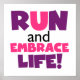 Om du kärlek till springa, springa 5 KS, 10 KS, halvmaratoner eller maratoner, så kan du kärlek den färgstarka textdesignen i lila och rosa som läser Springa och Embrace Life! Springa och Embrace: T-shirts, mugg, påsar, kort, klistermärken, nyckelringar, munspadar, iphone case, magneter och mycket mer!
