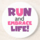 Om du kärlek till springa, springa 5 KS, 10 KS, halvmaratoner eller maratoner, så kan du kärlek den färgstarka textdesignen i lila och rosa som läser Springa och Embrace Life! Springa och Embrace: T-shirts, mugg, påsar, kort, klistermärken, nyckelringar, munspadar, iphone case, magneter och mycket mer!