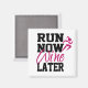 Rolig magnet med svarta och vinröda bokstäver "Springa Nu Vin Senare" med en rosa löpare på sidan. Dessa skulle vara en bra present till löparen i ditt liv! Sätt ett LEENDE på deras ansikte!