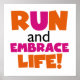 Om du kärlek till springa, springa 5 KS, 10 KS, halvmaratoner eller maratoner kommer du att kärlek den här färgstarka textdesignen i orange och shock rosa som läser Springa och Embrace Life! T-tröjor, hoar, magneter, knappar, kort, klistermärken, nyckelringar och många andra artiklar för springer som kärlek har en klar och färglös kördesign!
