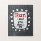 En söt typografisk design som säger "Springa like you Elak It". Den har svart och röd text på en vit rektangel med funky, lekfulla vita prickar runt den, allt på en grått-bakgrund.