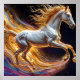 En fantastisk representation av en galopperande häst med flödande gyllene man omgiven av livfulla abstrakta element som förmedlar snabbhet, kraft och skönhet i equestrian elegans och konstnärlig design.