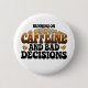 Rolig badge med citat "Springar På Kaffe Och Dåliga Beslut" i ett roligt svart typsnitt, förutom ordet kaffe som är i brunt. Nedanför citatet finns ett par enkla kaffebönor.