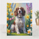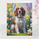 En glad hund sitter fridfullt på frodig grön gräs, omgiven av färgrika vårblommor under en mjuk blå himmel. Denna digitala oljemålning fångar ett stillsamt ögonblick med uttrycksfulla penseldrag, varma färger och en känsla av mild glädje.