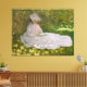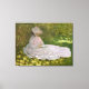 Claude Monet, olja på canvas 1872, är en landskapskonstruktion av en ung kvinna i fakturerande vit klänning och vit bonnet som sitter i skugga under en grupp träd och läser en bok. Runt henne går det intensiva ljuset från det varma vår sol genom löven på träd, och det gapar på det ljusa gräset och hennes klänning med starka solskyddsfläckar. Monet målade bilden i snabbt applicerad, lös penseldrag av olja färg, och fångade upp ett pastoralt moment av kvinnans omgivning mitt i naturen. Värdeintervallet från ljus till mörk och harmoni mellan grönt, brun, grått och vit ton fångar ljus, färg och atmosfär från en scen som målats ur livet. Claude Monet (1840-1926) var en av grundarna och huvuddrivkrafterna bakom den Fransk Impressionistiska målarskolan. Monet är född i Paris och har studerat med Eugene Boudin, som har lärt sig grunderna för oljemålning och plein-luft (öppen luft) ålmålning, och senare med målaren Charles Gleyre, som till slut är vänner med de olika imperialisterna Manet, Renoir, Bazille med flera. Förkastad av Paris Salon och andra platser vid 1800-talets akademiska inrättning, målade impressionisterna direkt från naturen, fångade upp flyktighetsmoment i tid, i ljusa, sönderslagna färg och små, snabba borshstrokningar. Monet bodde och studerade i London och Nederländerna och gav många målningar fram till den första Impressionistiska utställningen 1874, där hans målning Impression: Sunrise fick beröm och förtjänade sin berömd moniker. Efter att hans barn och hans förste fru Camille dog, bosatte sig Monet i Giverny, där allt större framgångar gjorde det möjligt för honom att etablera ett hem och en studio omgiven av utvecklade trädgårdar. Monet målade upp många landskap, inklusive trädgårdsscener och hans berömd katedralserie, med allt större oro för ljus, färg och atmosfär, med oro för färg och former som i sin äldre ålder gränsade till ett slags abstraktion, skapar honom en av de mest uppskattade målarna från den moderna tiden.