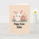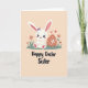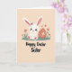 At the center of the card is a cute white bunny with long ears, soft pink inner-ear details, and tiny pink paw pads, wearing a small lavender bow that adds a sweet, friendly touch 🐰. Its wide dark eyes and rosy cheeks give it a tender, affectionate look, as if it’s sitting close for a cozy moment with someone it cares about. The bunny rests on a narrow strip of green grass, with simple coral-and-green flowers on either side that suggest early spring 🌷. To the right sits a decorative oval egg in a deep reddish-orange shade, covered with small white flowers and heart shapes that echo the bunny’s gentle expression. Above them, two small red hearts float in the peachy background, like a quiet sign of closeness between friends or sweethearts. The lighting stays soft and warm, with rounded shapes and pastel tones that keep the scene calm and inviting. Along the bottom, a seasonal greeting is written in thick, hand-drawn lettering in deep charcoal black, centered beneath the illustration. The egg’s white heart motifs stand out crisply against the reddish-orange surface beside the bunny.