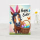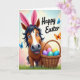 This card features a friendly, stylized horse-like character facing forward with wide, gentle eyes, and its bright pink bunny ears 🐰 add a sweet, flirty twist to the expression. A dark mane frames warm brown fur and a lighter snout, giving the face a soft contrast that feels welcoming, like a friend leaning in for a photo. Beside the character sits a woven basket brimming with glossy eggs in purple, pink, green, yellow, and blue, arranged like a shared treat waiting to be discovered. The ground is a thick spread of green grass, and the sky above fades through soft blue with hints of pink and yellow, like early morning light. Two butterflies—one blue and one orange—float nearby, adding little sparks of motion around the character’s calm, affectionate gaze 🐇. The words “Happy Easter” appear near the top in flowing lettering, set in a dark tone that stands out against the pale sky. The basket’s curved handle arches over the eggs, and the grass blades are drawn with small, textured strokes along the lower edge.