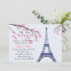 En romantisk inbjudan som presenterar det Eiffel torn och de blomma rosa grenarna mot ett ljust - grå damastast bakgrund. Passande för en födelsedagsfest eller någon kvinnlig firande, luncheon eller möhippa.