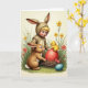 Designed with a springtime scene, the card features a fair-haired child in a tan animal suit with tall ears, standing in soft, diffused light beside a fluffy cocoa-brown rabbit 🐇. The child’s bright blue eyes and rosy cheeks turn toward the rabbit with a tender, trusting look, as if sharing a quiet secret. Near their feet sits a loosely woven nest, drawn with fine strands that feel almost touchable. A large red egg rests in the nest, and a tiny downy yellow chick perches on top, leaning forward as though greeting the pair 🐰. In the grass nearby, a smooth blue egg adds a calm cool note against the fresh green ground. Small yellow flowers and soft pink blossoms dot the scene, framing the characters like a gentle garden border 🌷. The greeting text appears at the top in a simple, dark font, with a smaller line near the bottom in a warm red tone, while the red egg gleams at center with subtle highlights.
