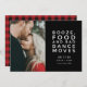 Snyggt modern sparar datumen för det roligt-älskande paret som inte kan vänta med att fira med sin familj och sina vänner. Svart och vit typografi med ditt foto som lyder: Sprit, mat och dålig dans rör sig. Anpassa med ditt foto-, namn- och bröllop-datum. Återgår till en röd och svart buffel på baksidan av kortet.