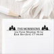 Rustiska returetiketter med ditt namn följt av tre spruce träd på vardera sidan. Svarta och vita returetiketter med träd för ett roligt utseende, perfekt för rustiskt bröllop, julpost, julhelg med mera.