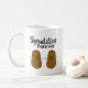 Rolig mugg till din bästa vän. två glada bruna potatisar som står mittemot varandra med prickar för ögon och en stor leende mun. Ovanför dem i svart text står det Spuddies Forever.